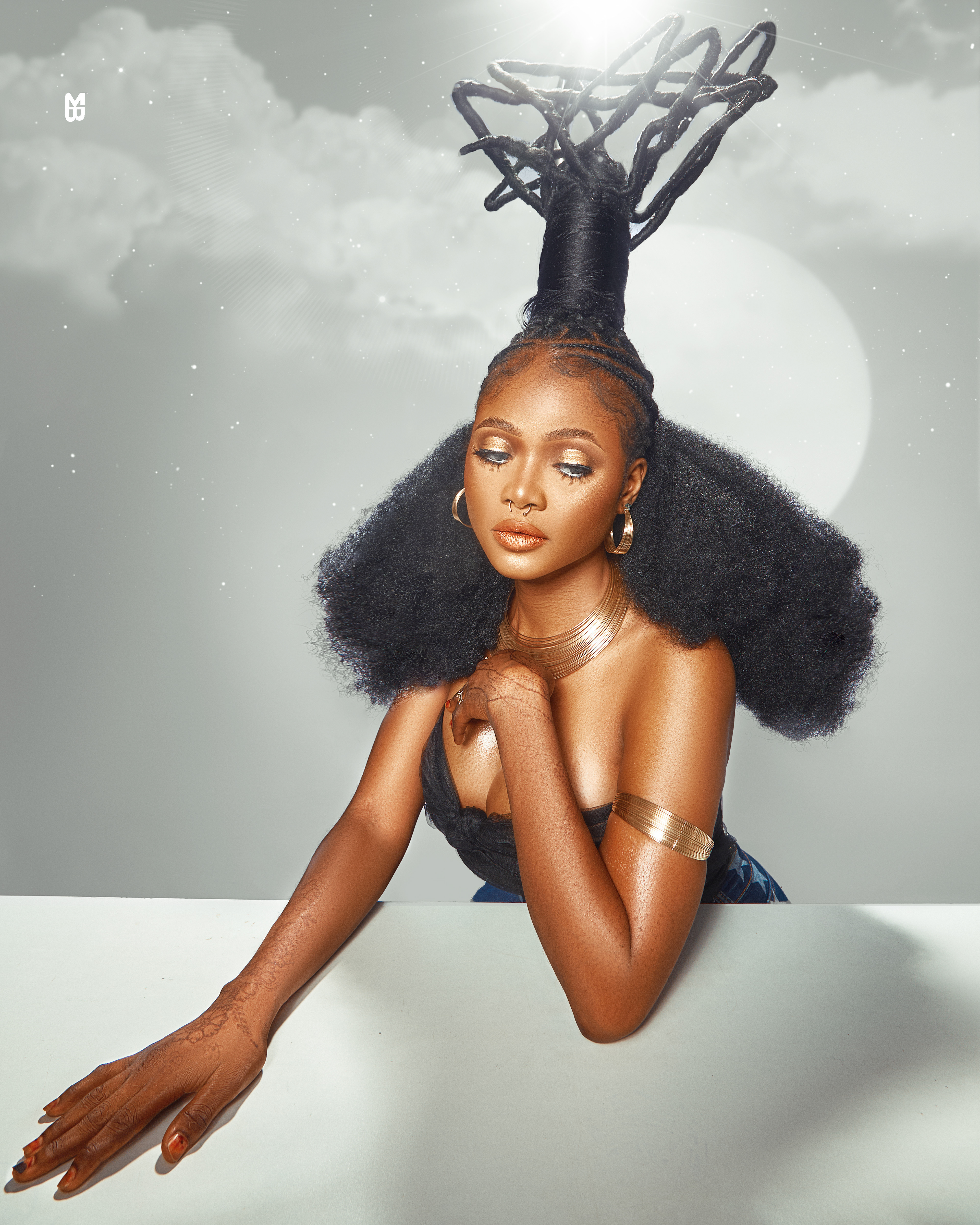 Amidst the richness of African heritage, stands a melanin goddess, adorned with gold chains and bracelets that gleam with the light of a thousand sunsets. Her hair, styled in a beautiful and intricate African fashion, crowns her head with the elegance of tradition and the splendor of royalty. She exudes a regal presence, a testament to the power and grace of African women throughout the ages.