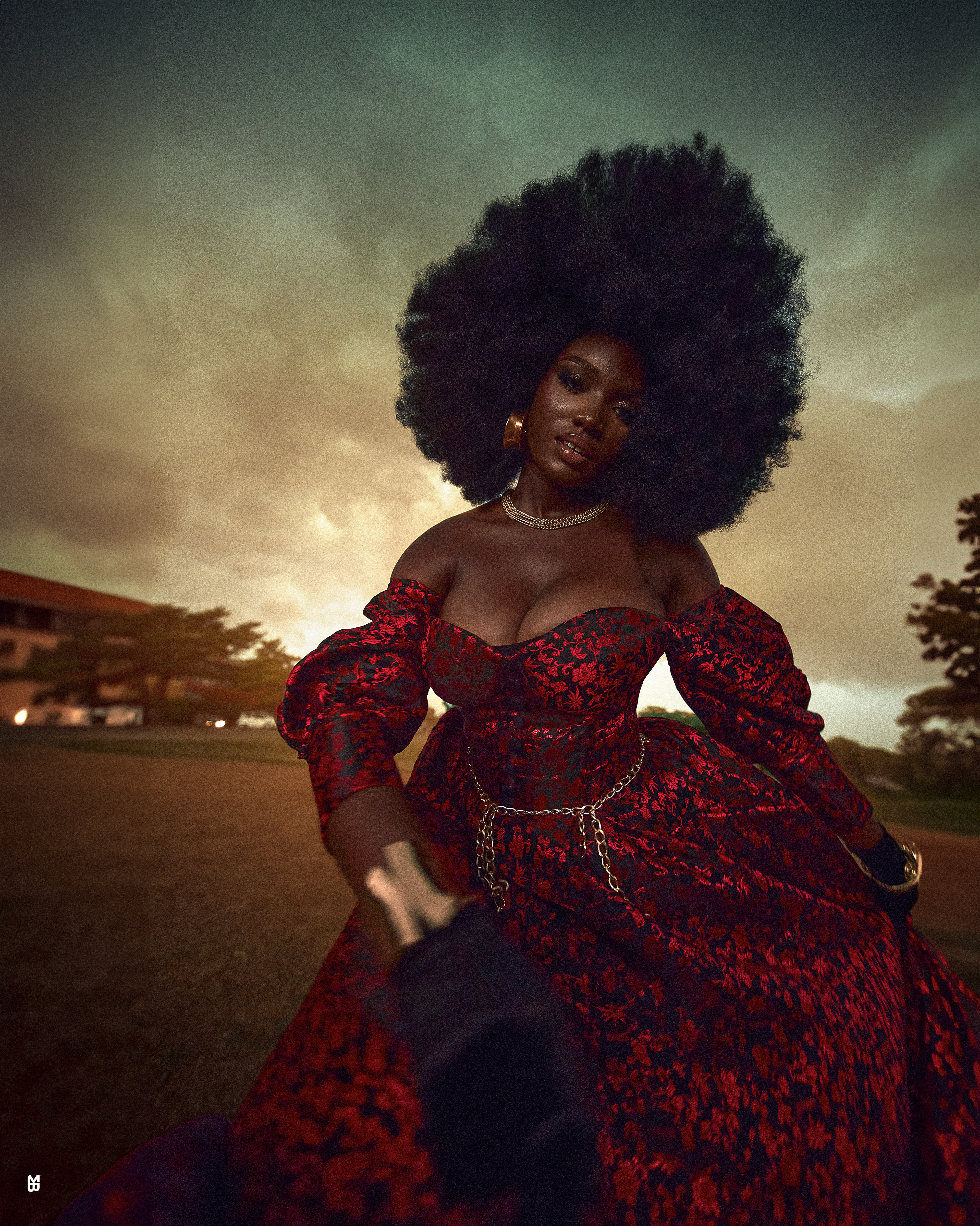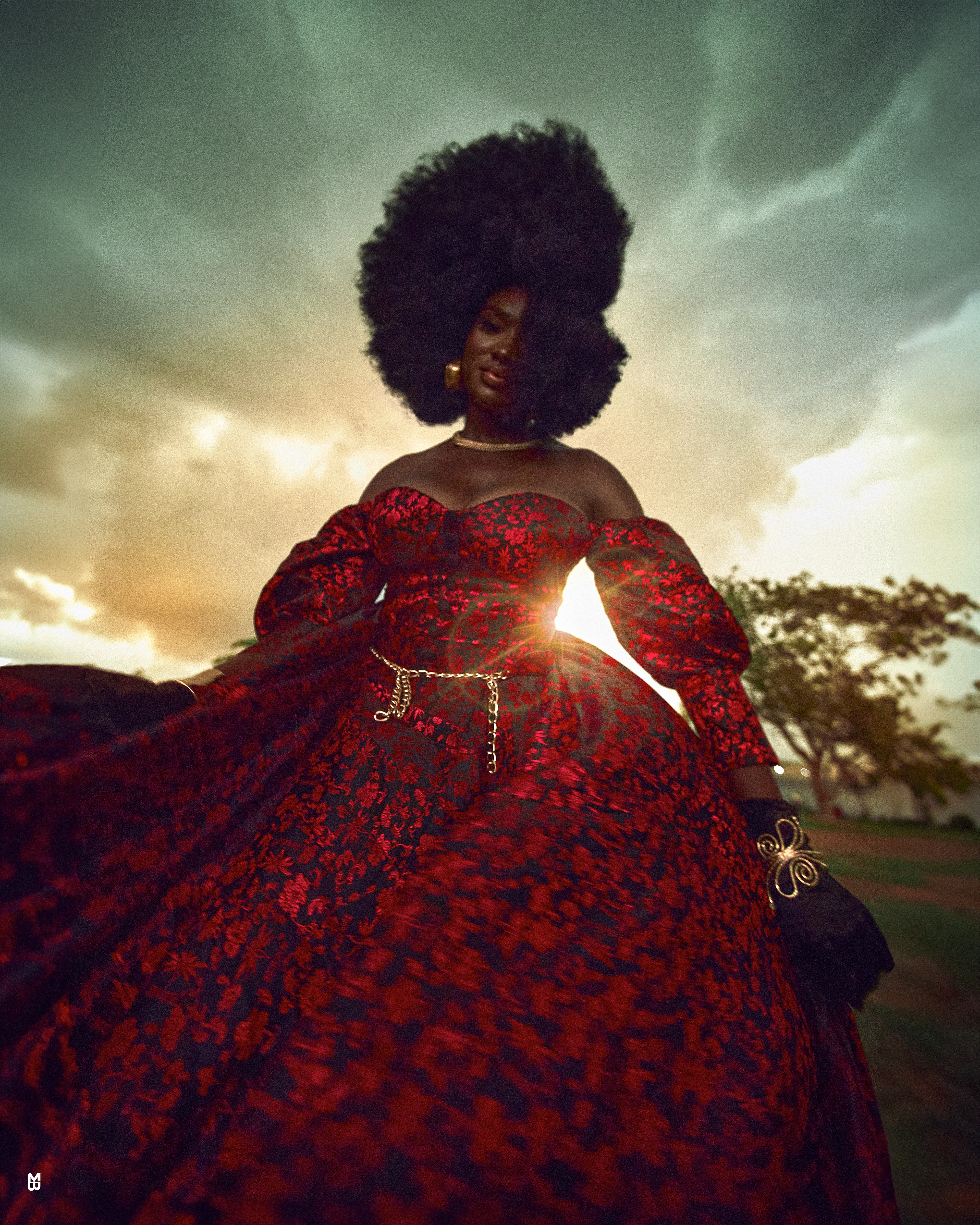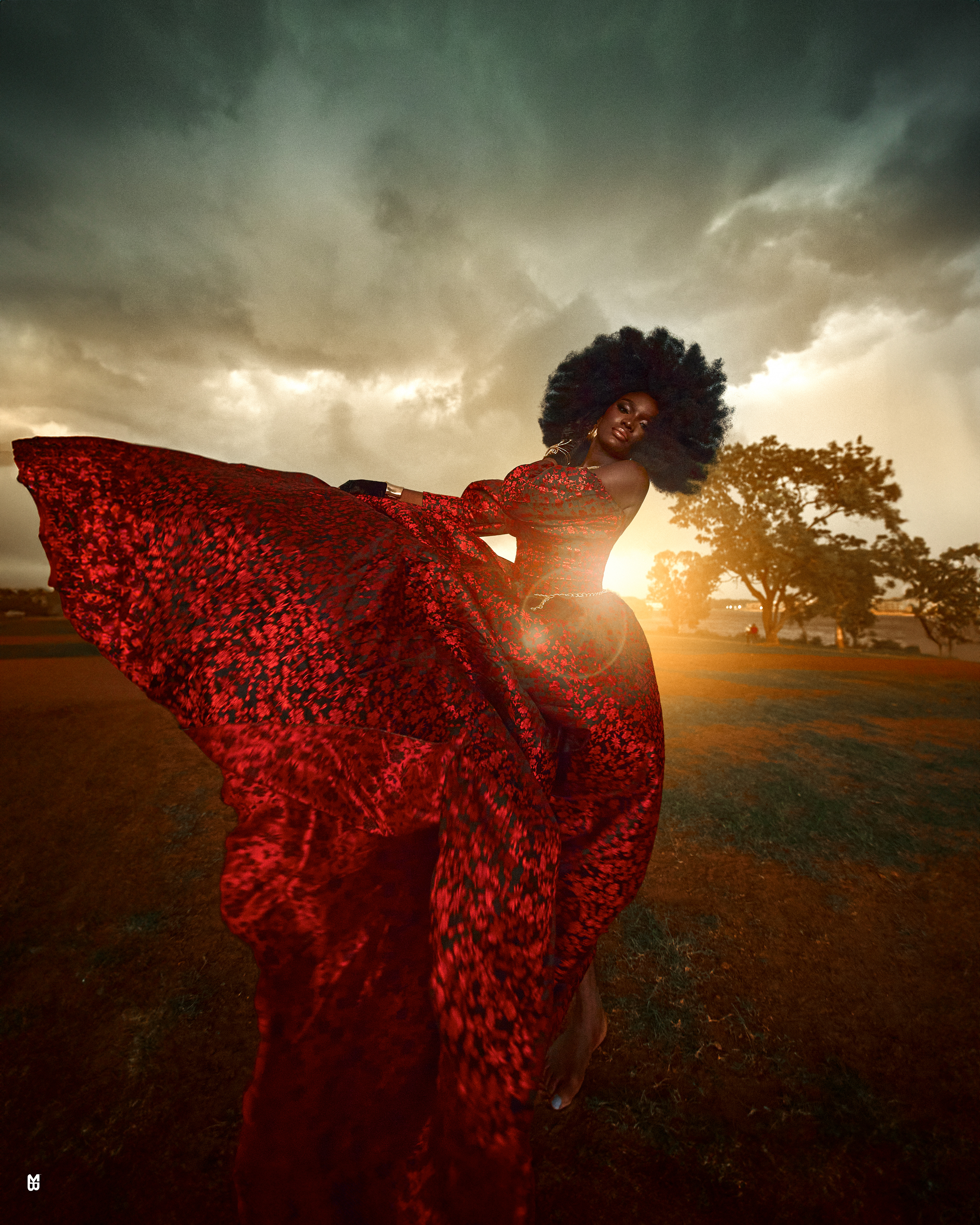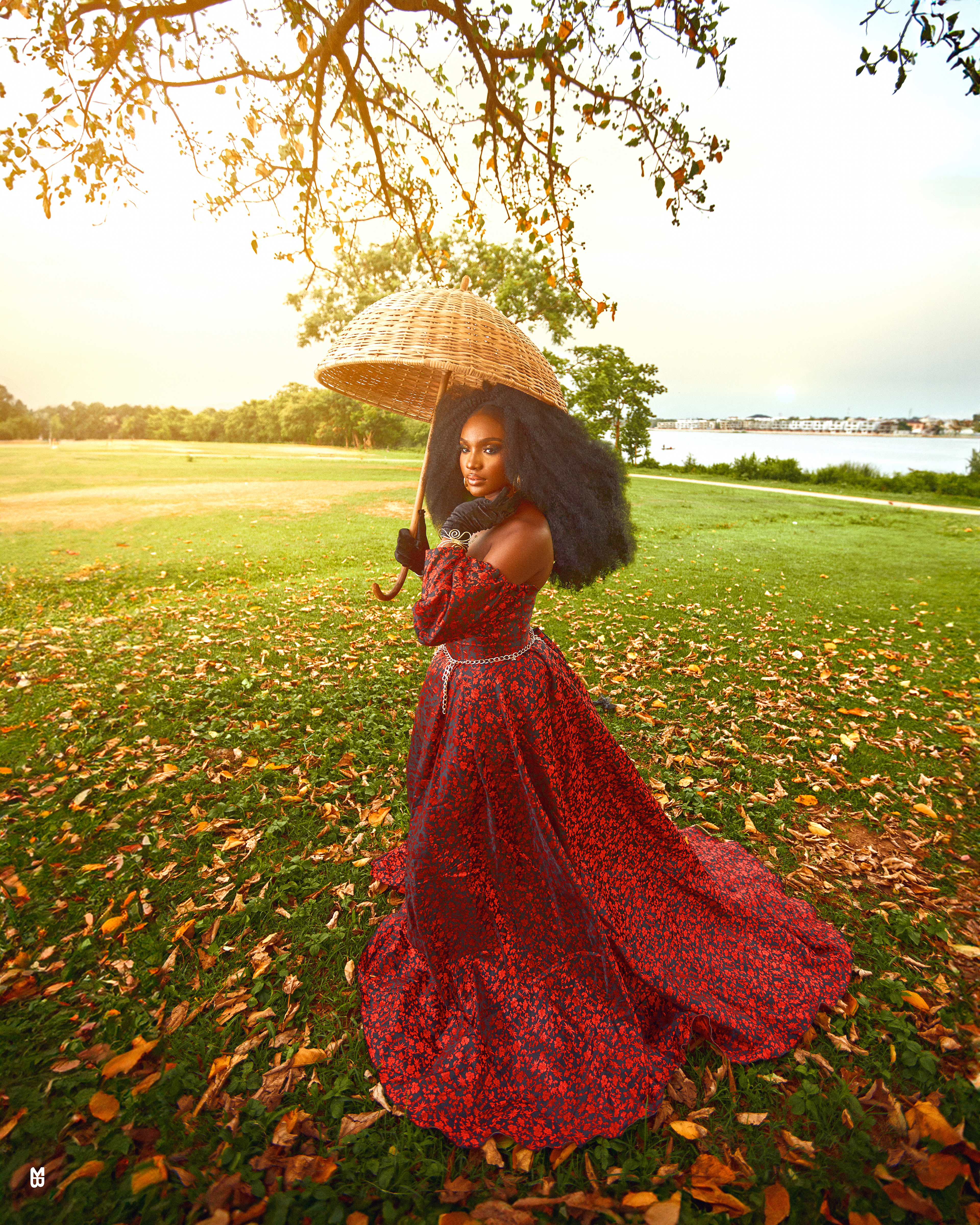 In a picturesque field, a melanin model exudes vintage charm with a flowing red dress, creating a scene of timeless elegance. The gentle sway of the dress and the serene presence of a majestic horse add to the enchanting ambiance, capturing the essence of classic beauty and grace. This image beautifully blends the rustic allure of nature with the sophistication of vintage fashion, transporting us to a bygone era where style and tranquility coexist.